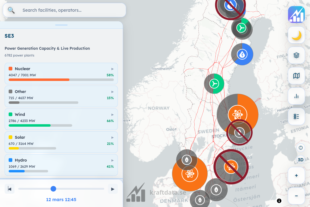 Sajten är en användarvänlig, digital tvilling av kraftsystemet i en dynamisk karta som visar elproduktion i realtid för varje kraftverk. Användare kan snabbt visualisera produktion, följa förändringar över tid och filtrera vyer för tydlig överblick.